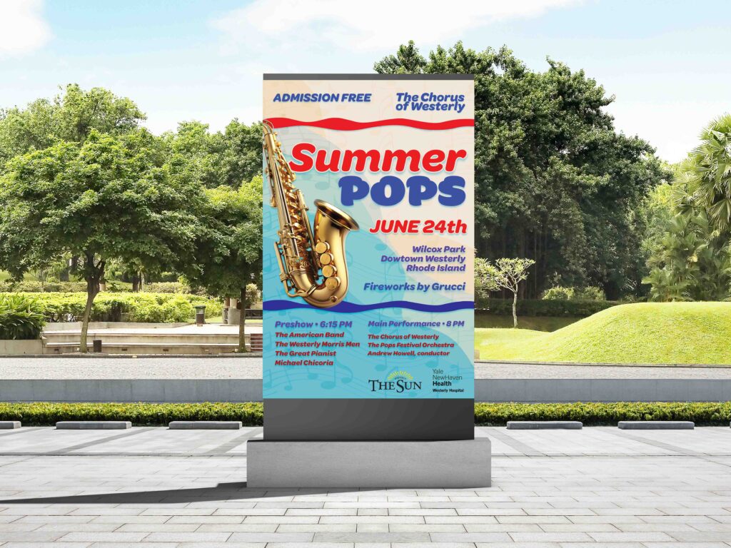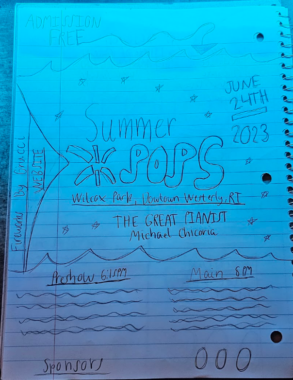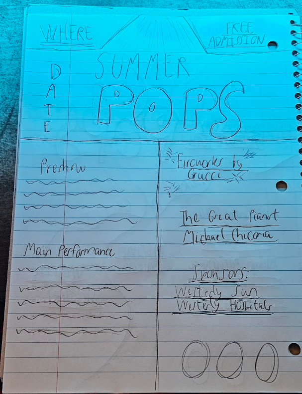 For this asssignment, I was taksed to create a poster, town pole banner, and postcard for The Chorus of Westerly Summer Pops. I had to sketch out my ideas for what the poster, postcard, and town pole banner would look like then bring it into photoshop and illustrator. I had to follow certain color schemes that I was given and produce a design that captures the viewers attention.