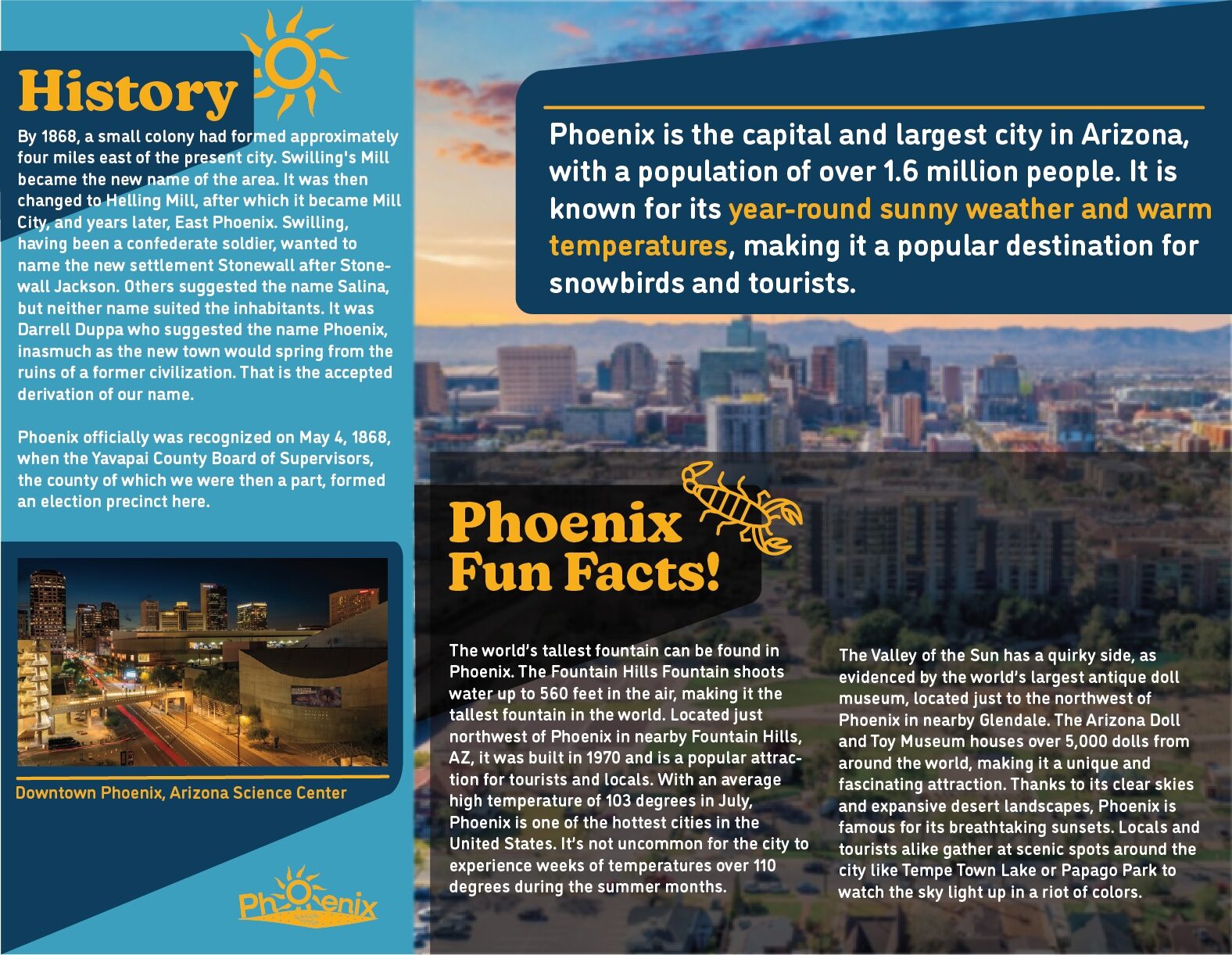 For this assignment, I was tasked to create a logo and brochure for any city of my liking. I ended up choosing Phoenix because that’s where I used to live a long time ago. I did multiple sketches of logos until I finally got one that I liked. Then, I proceeded to make the brochure with color layouts that would fit Phoenix.